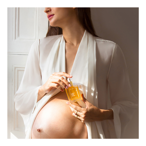 - Immediately follow with Golden Belly Serum, applying one full dropper to the palm of hand to warm and activate, massage into skin anywhere stretch marks appear using light, circular motions.